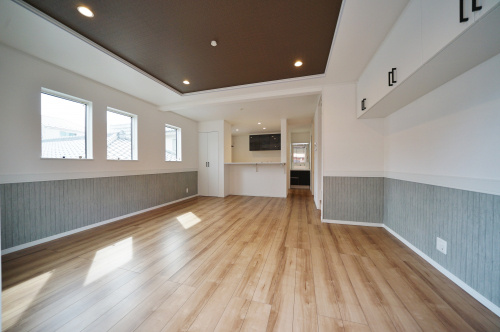 腰壁風のインテリアがおしゃれな広々約18帖のリビングは