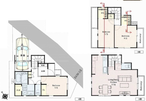 間取りは3階建て3LDK。2階の約17帖のLDKには床暖房がつき、
