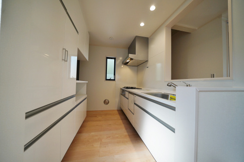 カップボードが装備されたキッチンは、収納豊富。