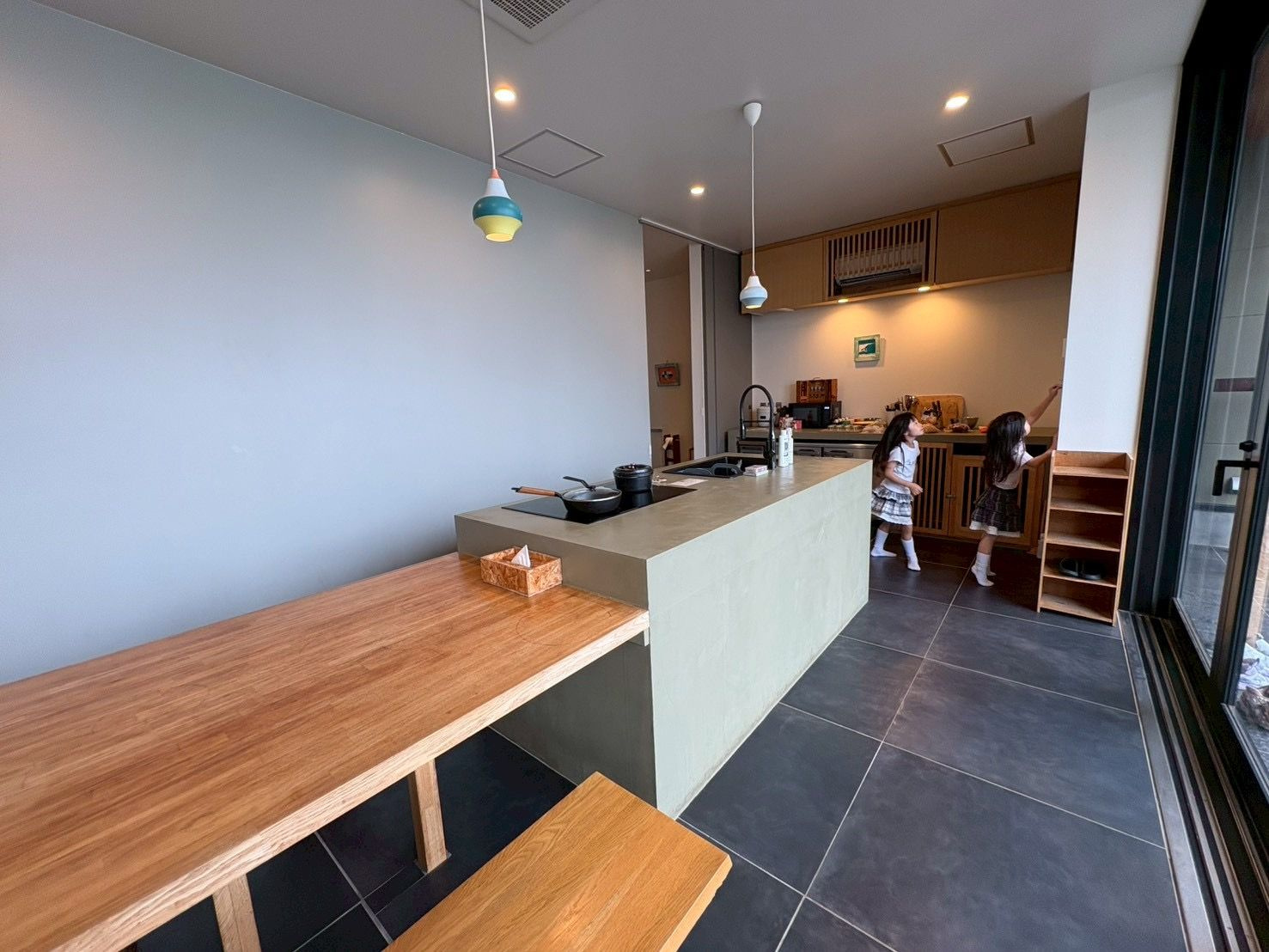 食材を購入してチェックインしました。オープンキッチンのリビングです。天井も高く前面ガラス張りで開放感があって良かったです。
