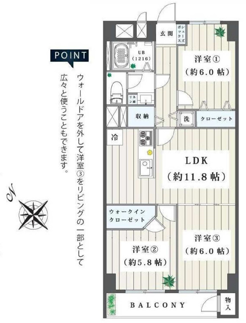 ウォールドアを外して、広いリビングの3LDKとして